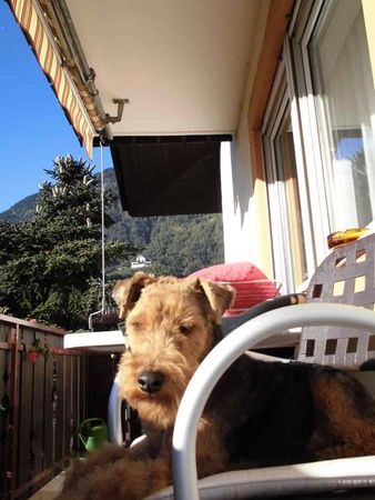 Monti von Familie Hauschild genießt die Oktobersonne auf dem Balkon.